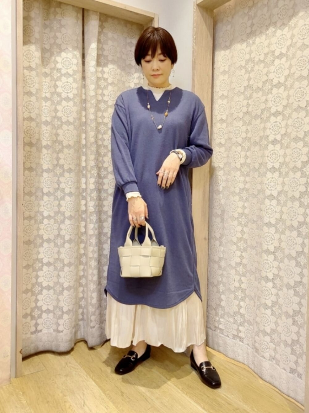 ご覧頂きありがとうございます! キーネックとラウンドヘムでスッキリとしたワンピースです♪ 気温の変化に応じてレイヤードスタイルをお楽しみ頂けると思います◎