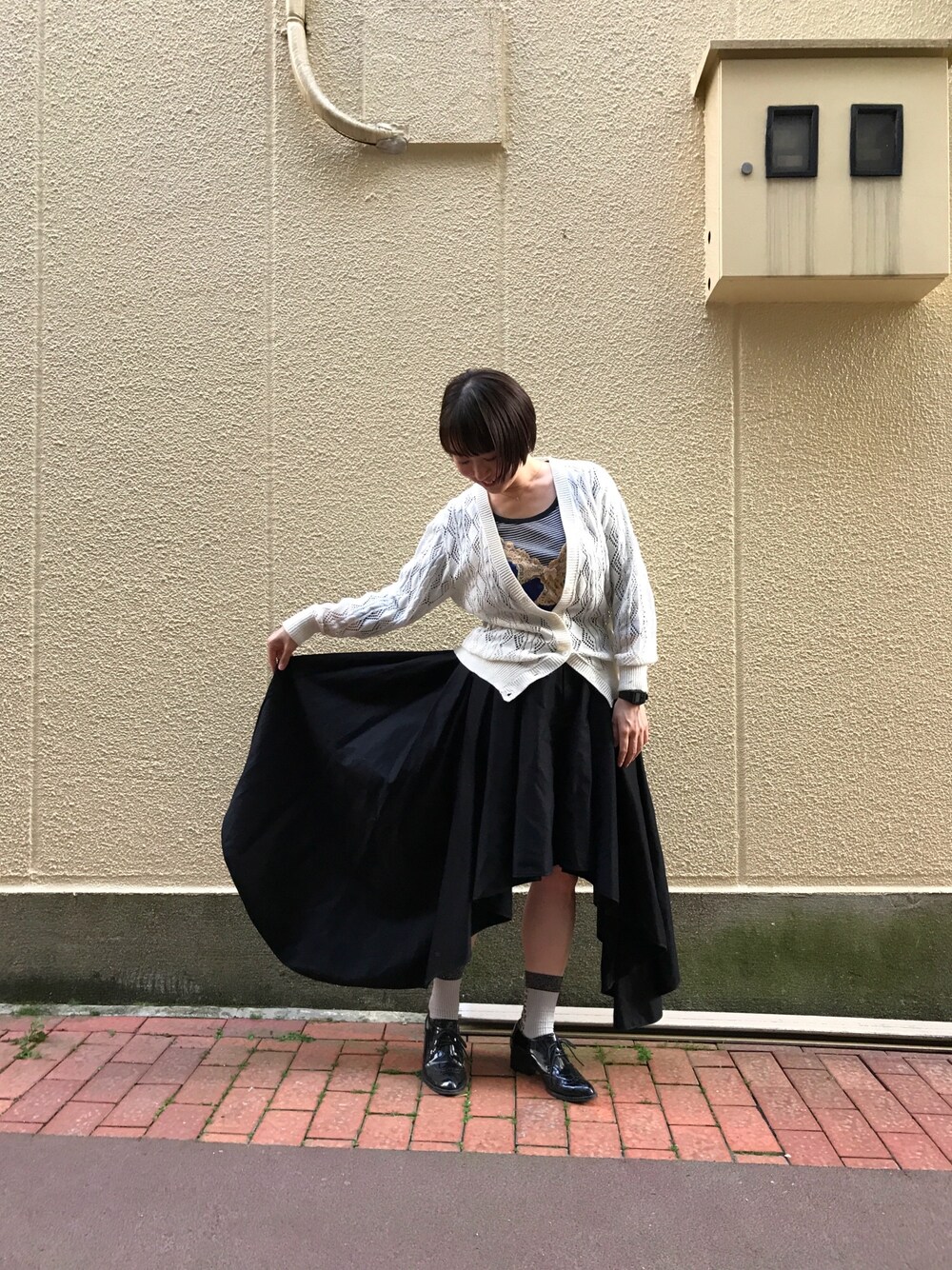 布がたっぷり!MEMUSEのフレアパンツ!! カーディガンが失敗だったな…もっと上半身はスッキリしときたかった。 白カーデとキャミは古着です。