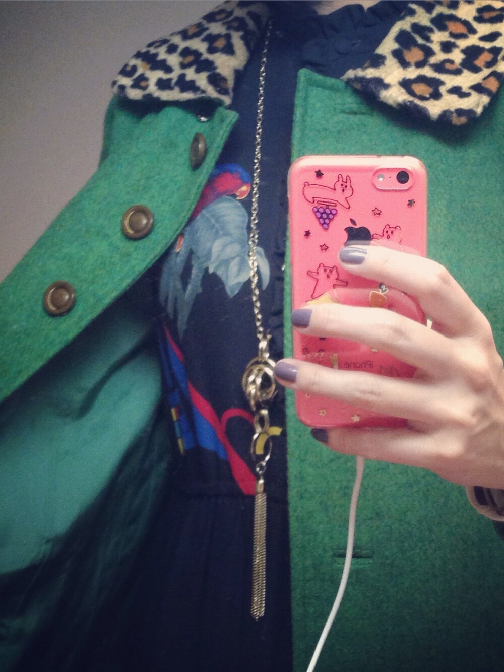 このコートは、豹柄の襟が最高に可愛くてお気に入りです。 やたら80s感ある謎の幾何学模様と鳥のワンピ。