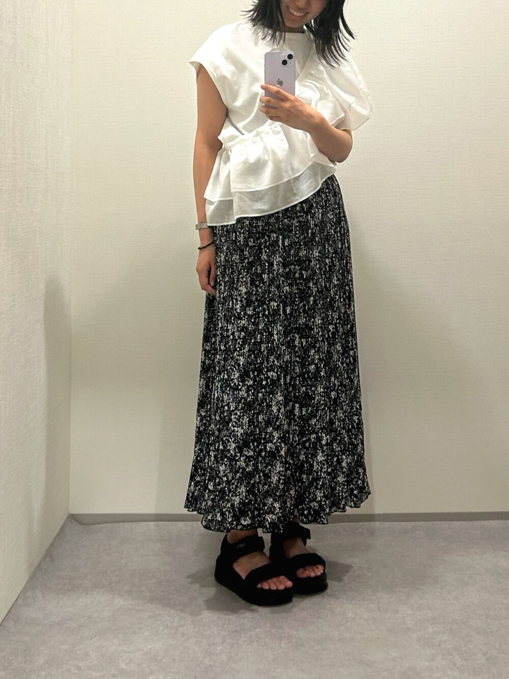黒の花柄プリーツとフリルのトップスでモノトーンだけど可愛く仕上げました🫶🏻 スカートは色んなアイテムと合わせられて着回ししやすくおすすめです!