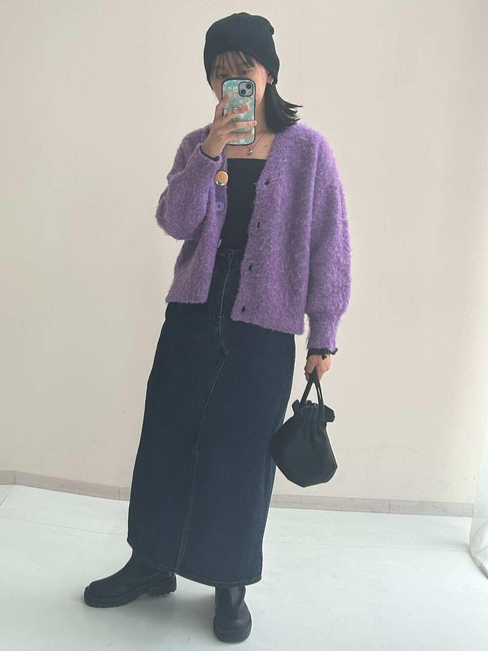パープルのカーディガンとシックな色で合わせてみました。 普段あまり着ない感じですが、こういうクールな感じも可愛いです🫶🏻