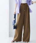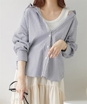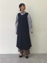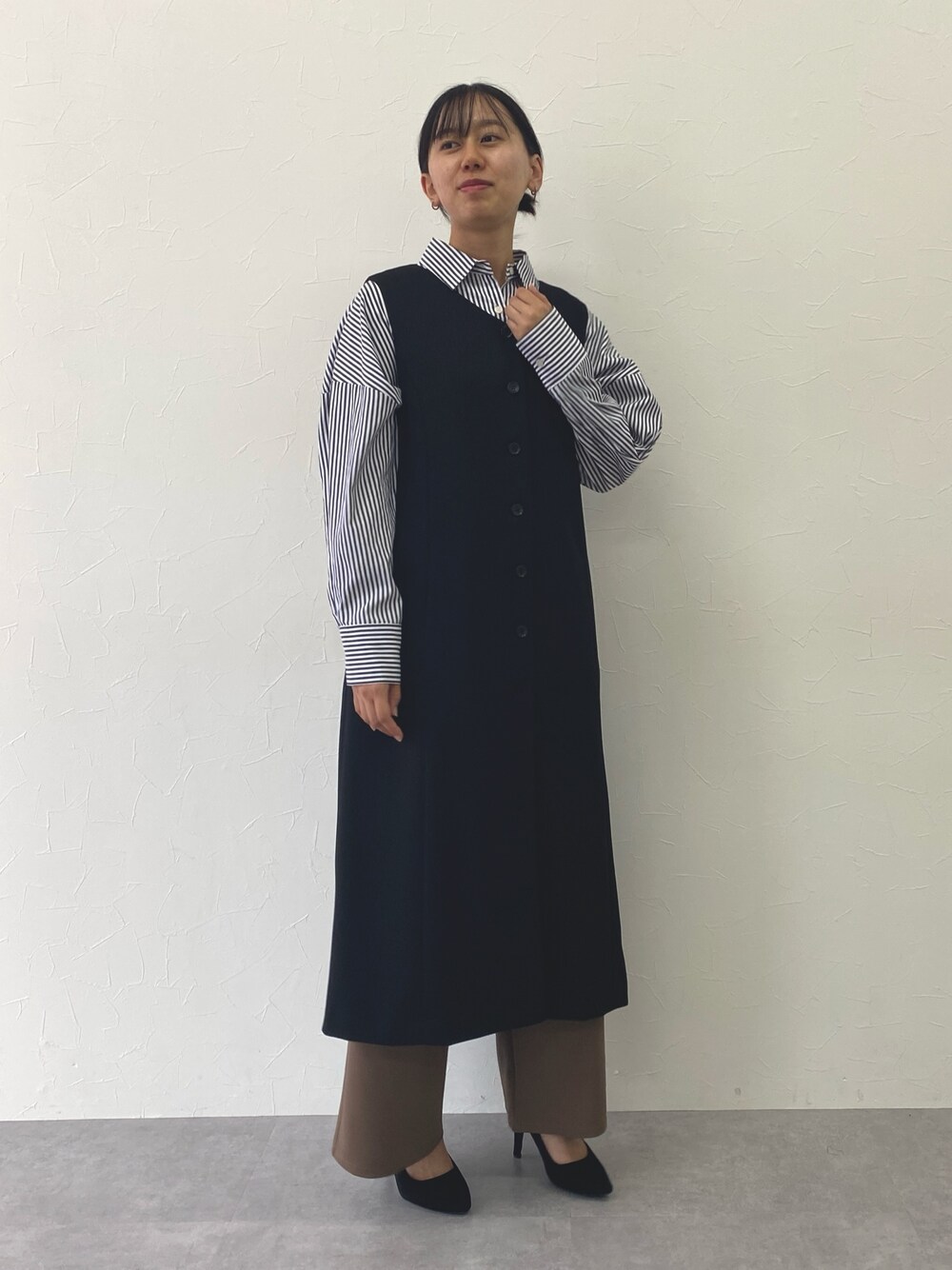 黒のワンピースにストライプシャツで爽やかに仕上げました。 締め色にブラウンのフレアパンツで秋らしさを取り入れています。