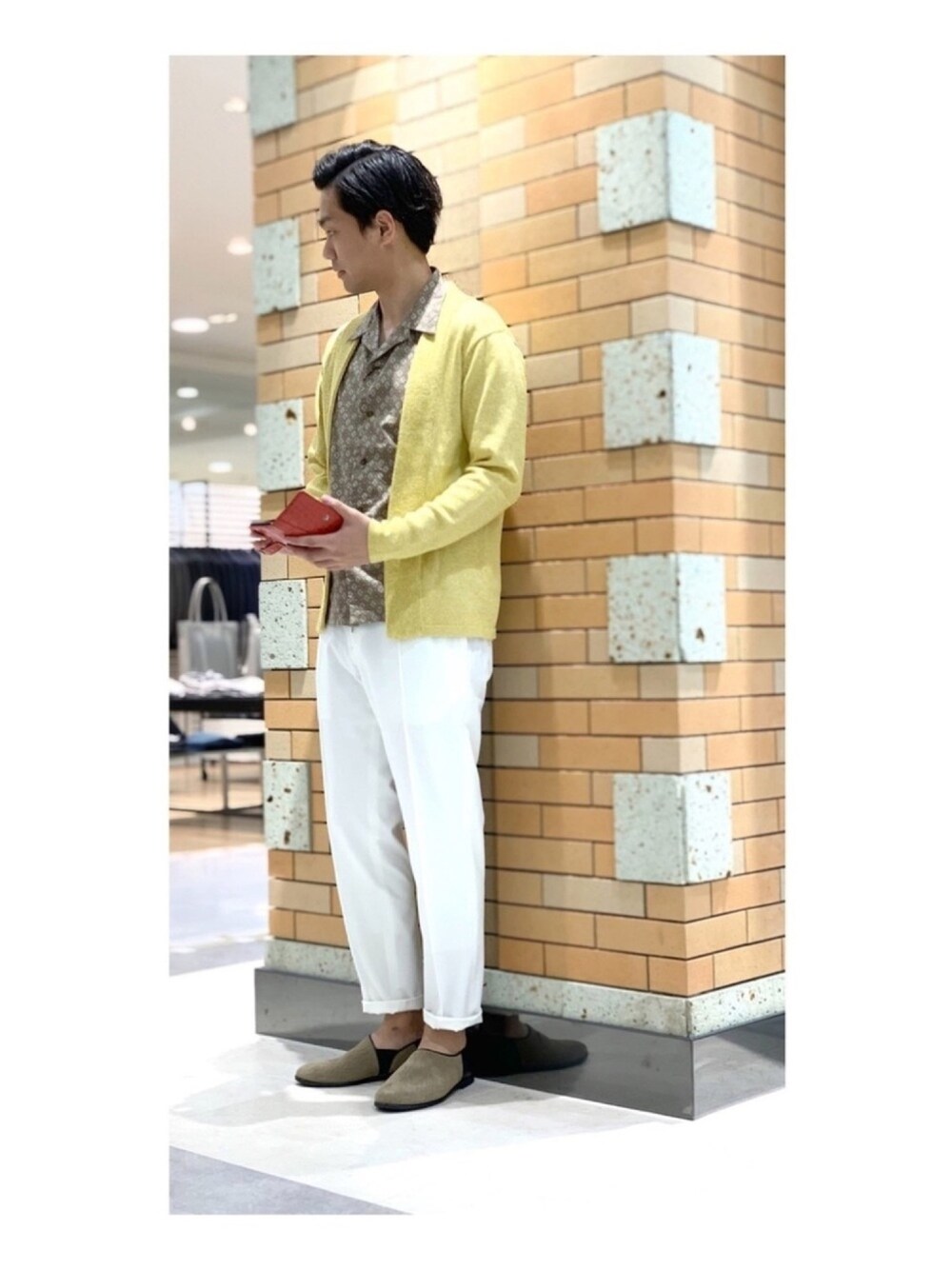 南国情緒漂うトップスのスタイリングに ボトムスには都会っぽさのある白パンで。 街歩きにも適したリゾートスタイル。