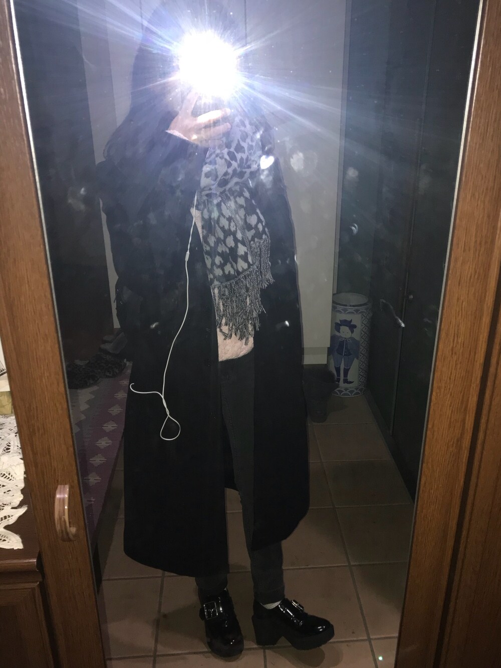 暖かさ、動きやすさ、歩きやすさ重視コーデ👣 ほとんどを黒でまとめて靴下とニットで白系プラス! 黒も重くなりすぎないように素材を変えてます💡