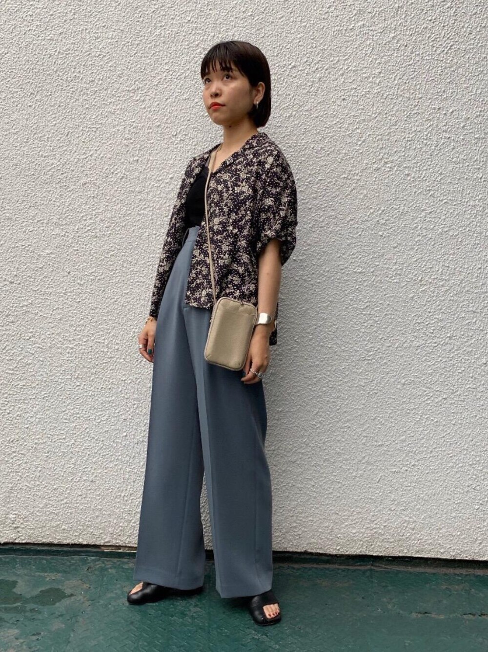 <リバティ>の開襟シャツを羽織り、ハイウエストのパンツと合わせてスタイルアップしました。