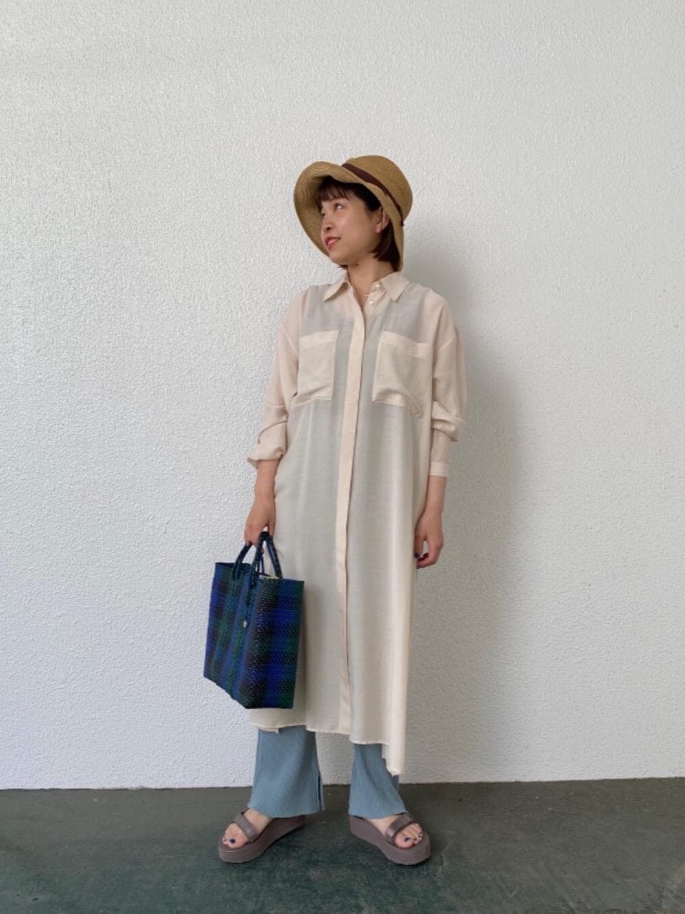 身長 158センチ 着用サイズ ワンピース Sサイズ 微光沢のシアーの質感がお洒落な シャツワンピースに リラックス感のあるリブパンツ、TEVAを 合わせてスタイリングしてみました。 ワンピースは今の季節から夏までの羽織としてもおすすめです。