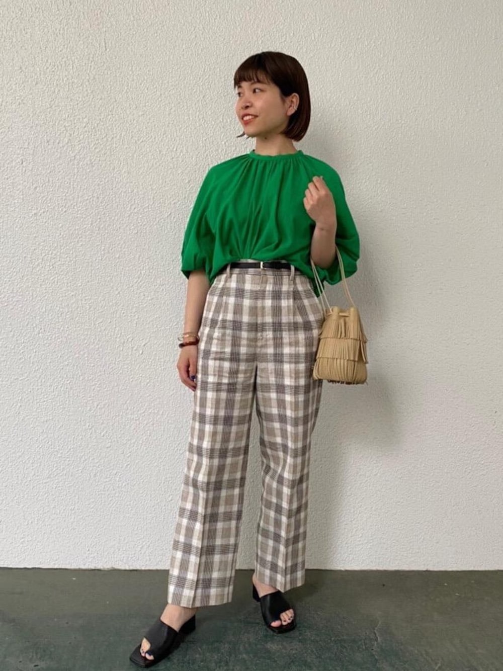 身長 158センチ 着用サイズ ブラウス フリーサイズ パンツ Sサイズ 麻ブレンドでお作りした、チェック柄パンツに 鮮やかなグリーンが印象的なブラウスを 合わせて爽やかにスタイリングしました。 パンツは色数を抑えたチェック柄なので、 カラーアイテムとの相性も抜群です