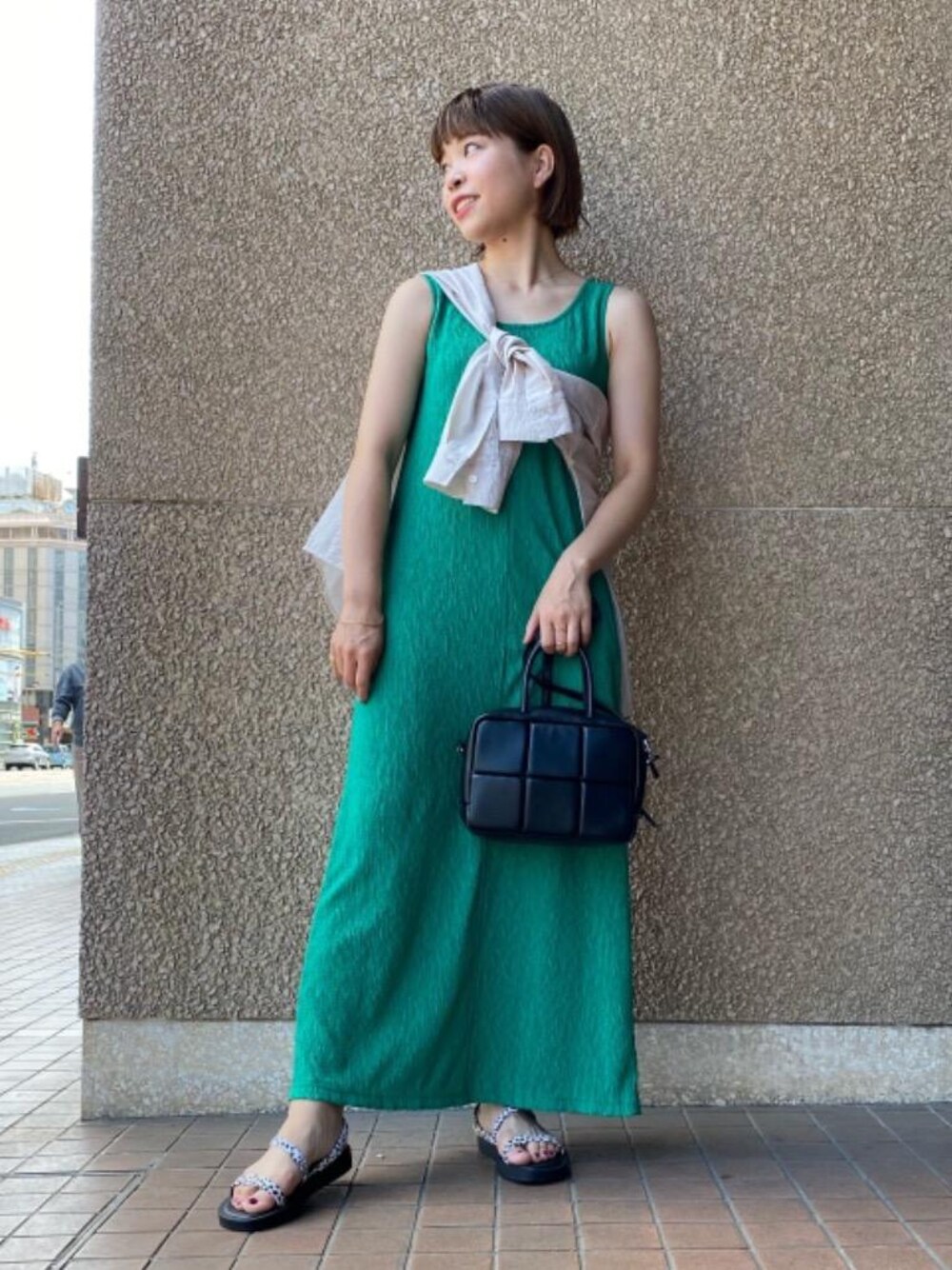 【身長】158センチ 【普段サイズ 】 トップス S/ボトムス S・M(商品によって変わります)/シューズ23.5 【サイズ感】 ワンピース:やや細身 【素材感と着心地】 ワンピース:裏地なし、透け感もありません。 とても軽くて涼しいので、これからの季節におすすめのワンピースです。 【コーディネートポイント】 鮮やかなグリーンのワンピースを主役に、小物はモノトーンで、カジュアルになりすぎないスタイリングを意識しました。