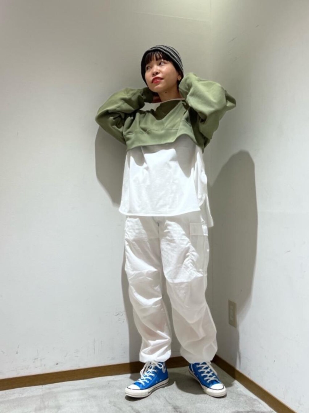 【身長】158センチ 【普段サイズ】 トップス/S ボトムス/S・M(商品によって変わります)/シューズ23.5 【サイズ感】 トップス:着丈は短めですが、身幅はゆったりとしていて様々なレイヤードスタイルが楽しめます。 【コーディネートポイント】 〈JANE SMITH〉の別注スウェットをメンズライクに着てみました。インナーに長めのロンTをレイヤードしてバランスをとりました。この春おススメのミリタリーパンツは白を選び爽やかなイメージでスタイリングしました。