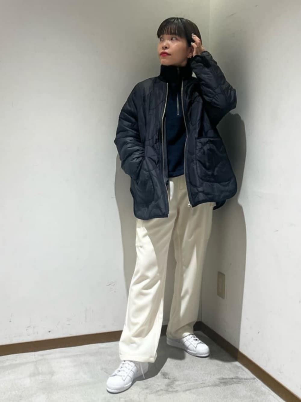 【サイズ感】 トップス:ややゆったり 程よくゆったりとしたシルエットにショート丈のシルエットがトレンド感たっぷりの一枚です。 アウター:ゆったり (Mサイズ着用) オーバーサイズで着たかったので、今回はMサイズを選びました。 【コーディネートポイント】 フリースのハーフジップのトップスと【別注】の〈adidas〉のスーパースターでスポーティーなスタイリングを組みました。ボトムスはオフホワイトで、上品さをプラスしました!