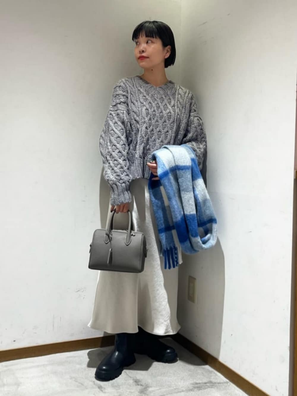 【サイズ感】 ニット:ややゆったり すっきりとしたVネックにややワイドシルエットで、トレンドライクに仕上げています。 スカート:標準的 ウエストゴムで伸縮性があり履きやすいです。 【コーディネートポイント】 グレーのケーブルニットを光沢のあるスカートで綺麗めな印象になる様な合わせにしました。寒色でまとめて、ブルーのマフラーをアクセントに加えました!