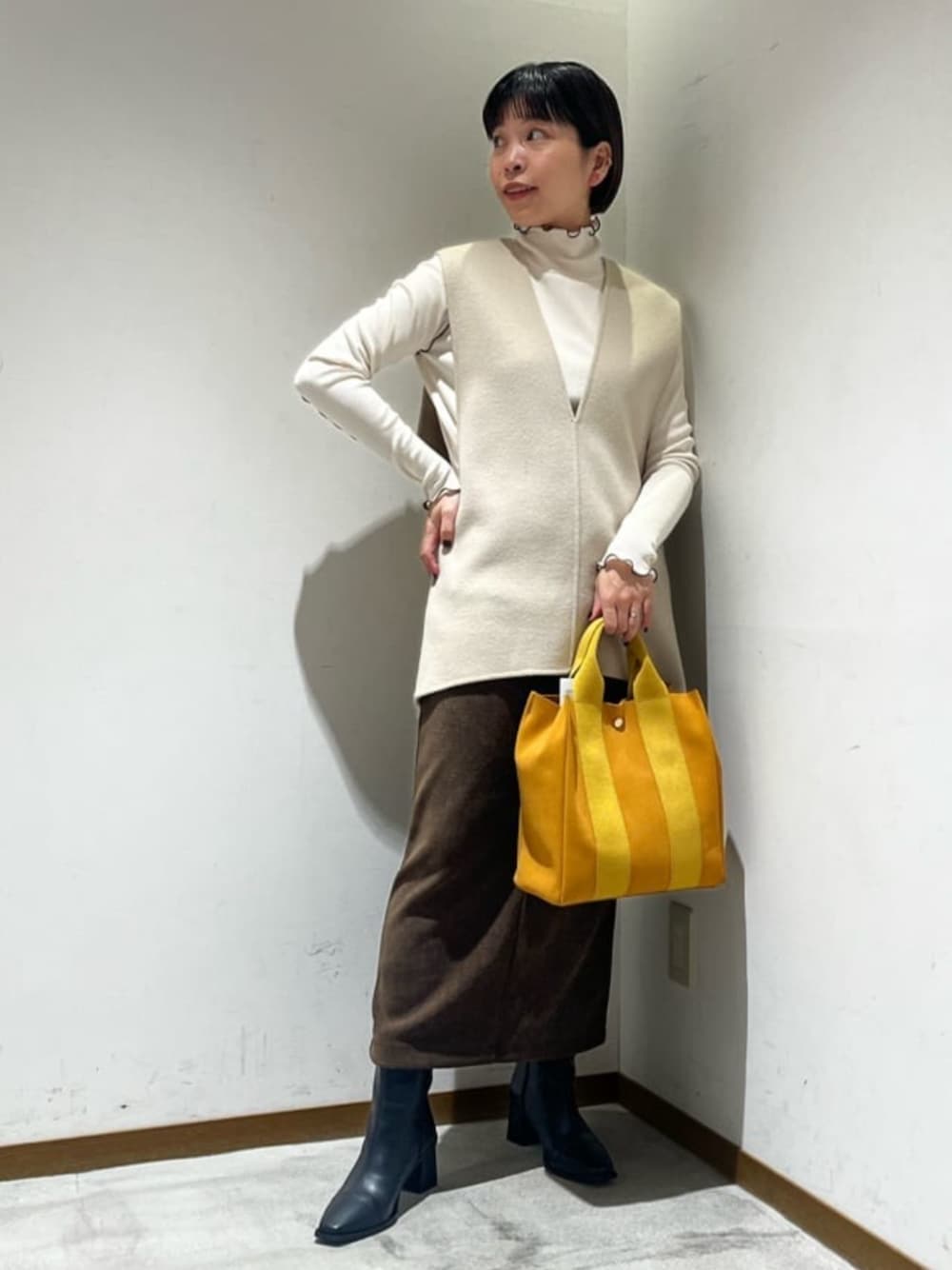 【身長】158センチ 【普段サイズ】 トップス S/ボトムスS・M(商品によって変わります)/シューズ23.5 【サイズ感】 ベスト:ゆったり 丈もはヒップがしっかり隠れる長さで、深めのVネックに、ゆとりのあるコクーンシルエットが抜け感漂う一着です。 スカート:標準的 158センチでSサイズ着用しています。すっきりとしたIラインシルエットです。 【コーディネートポイント】 すっきりとした、トップスとスカートのスタイルにコクーンシルエットのベストをプラスしてバランスをとりました。ベストはリバー仕立ての上品な表情が魅力的で、少し綺麗めな印象になります!