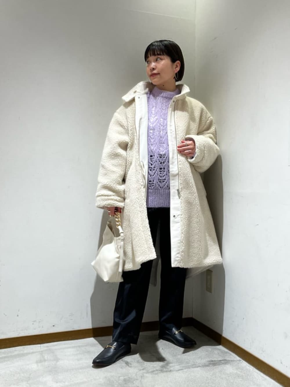 【身長】158センチ 【普段サイズ】 トップス S/ボトムスS・M(商品によって変わります)/シューズ23.5 【サイズ感】 ボアコート:ゆったり 158センチMサイズを着用しています。 ニット:ゆったり 丈はヒップが、隠れる長さで安心感があります。 【コーディネートポイント】 ボアコートはリバーシブルで、非常に暖かくおススメです。シンプルになりすぎないようにインナーに着用したニットは、透け感がポイントです! 白のTシャツと合わせるだけでおしゃれな雰囲気となります。