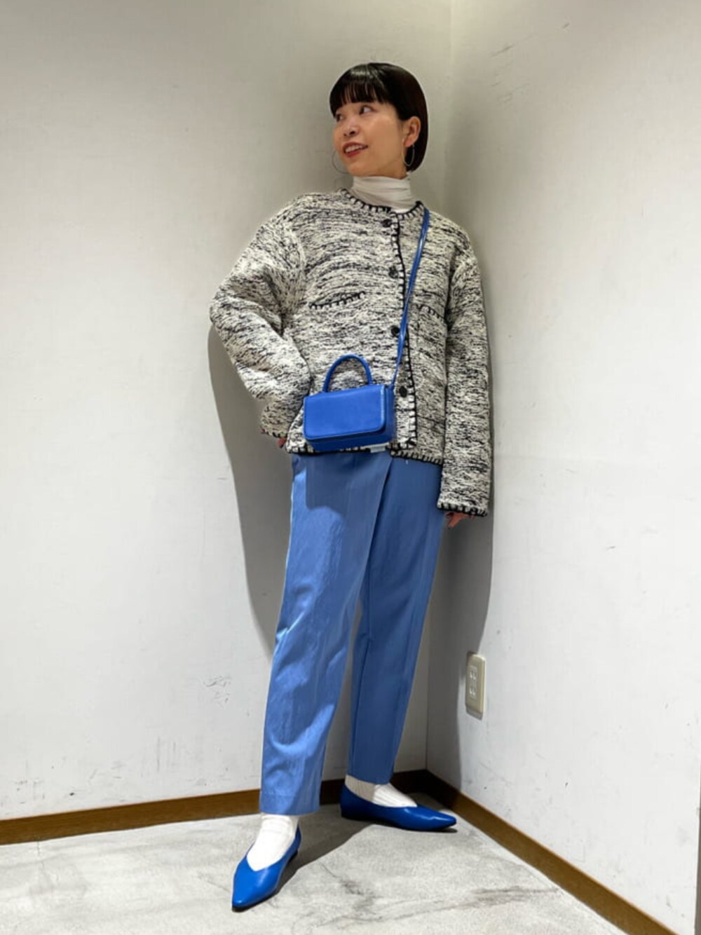 【身長】158センチ 【普段サイズ】 トップス S/ボトムスS・M(商品によって変わります)/シューズ23.5 【サイズ感】 カーディガン:ゆったり パンツ:ややゆったり 【コーディネートポイント】 少しフェミニンなスタイリングです。 (お仕事としても、いかがでしょうか?) カーディガンは前のボタンを留めてニットライクに着るのもおすすめです。