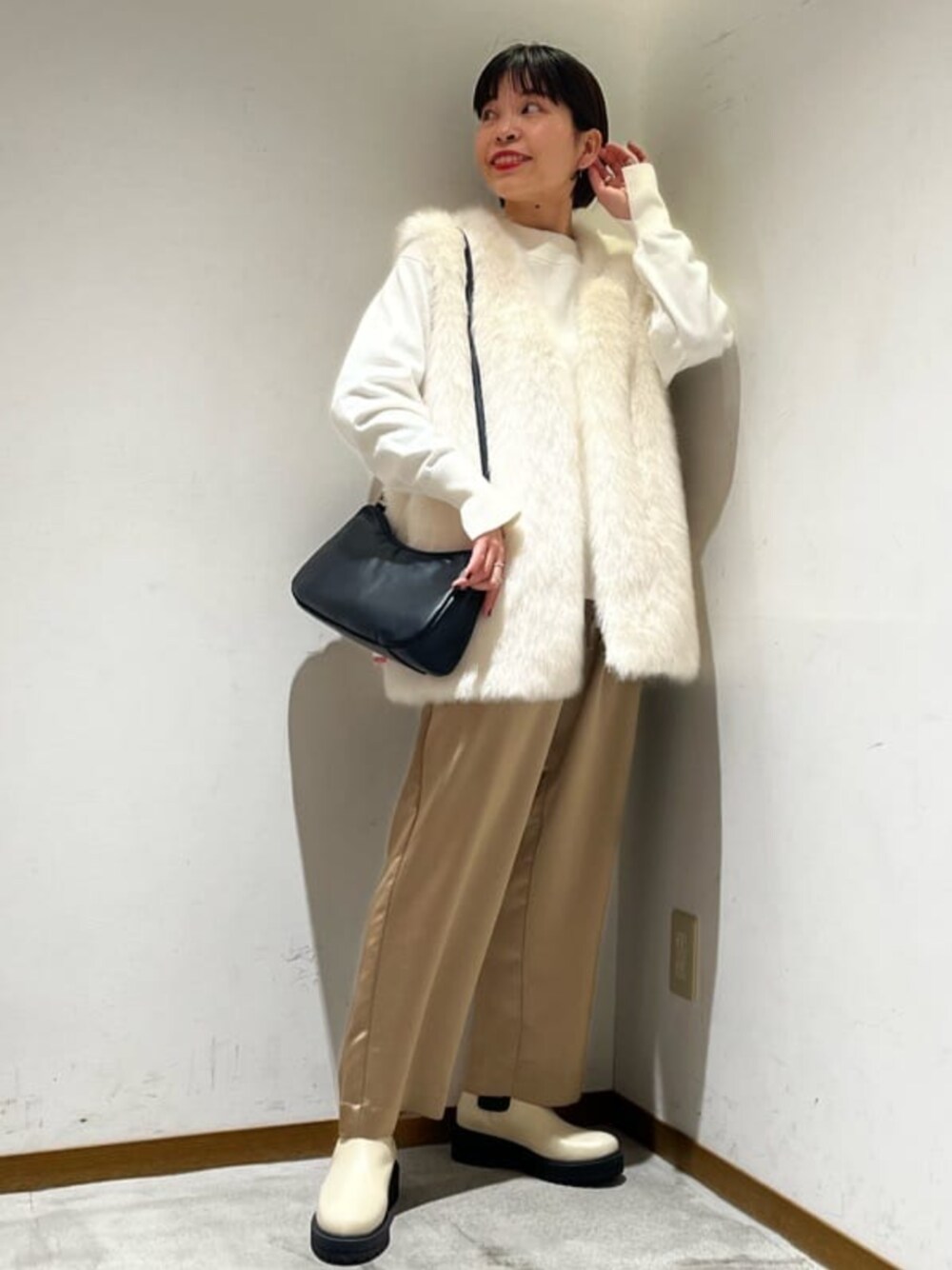 【身長】158センチ 【普段サイズ】 トップス S/ボトムスS・M(商品によって変わります)/シューズ23.5 【サイズ感】 ベスト:ゆったり ニット:標準的 パンツ:標準的 (158センチSサイズ着用) 【コーディネートポイント】 ファーベストを主役にクリーンなホワイトのニットですっきりと合わせました。パンツは光沢がお洒落なサテンパンツを選びトレンド感をプラスしました。