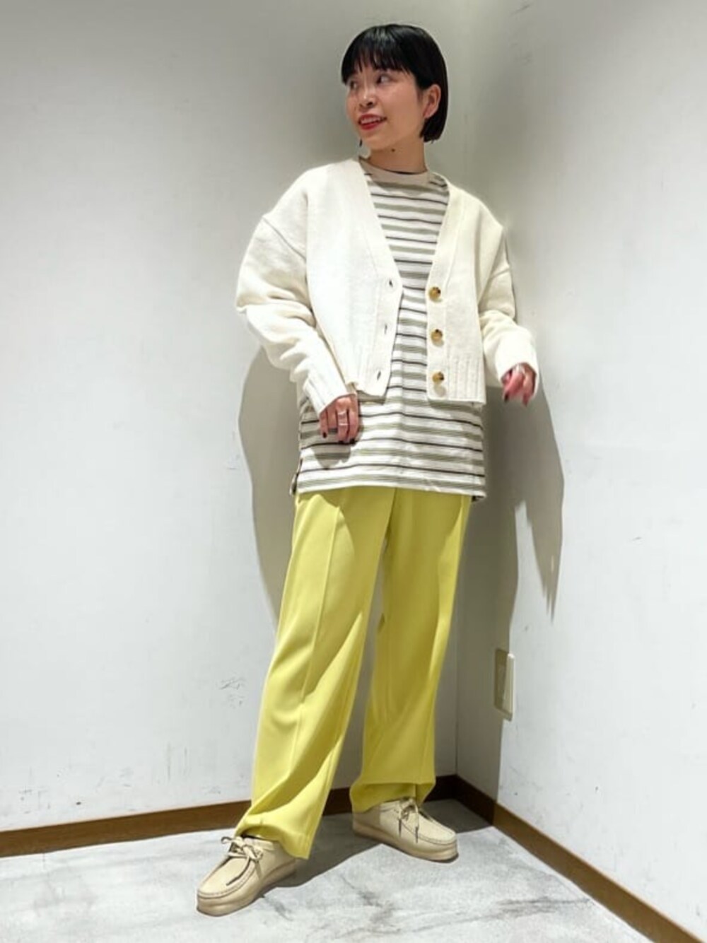 【身長】158センチ 【普段サイズ】 トップス S/ボトムスS・M(商品によって変わります)/シューズ23.5 【サイズ感】 カーディガン:身幅ゆったり 着丈短め パンツ:標準的 (158センチSサイズ着用) 【コーディネートポイント】 イエローとホワイトのカラーを中心に明るい印象のスタイリングです!春先にもおすすめの色合わせです。