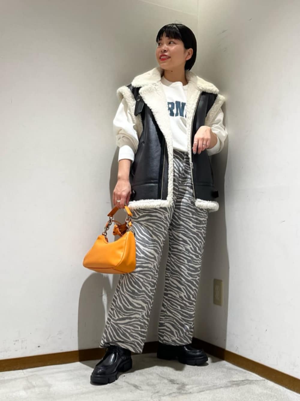 【身長】158センチ 【普段サイズ】 トップス S/ボトムスS・M(商品によって変わります)/シューズ23.5 【サイズ感】 スウェット:ゆったり パンツ:ゆったり (158センチSサイズ着用) 【コーディネートポイント】 ゼブラ柄のパンツを主役に、クリーンなホワイトのスウェットでカジュアルさをプラスしました。 全体的にモノトーンで落ち着いた印象になったので、オレンジのバックを差し色でプラスしました。