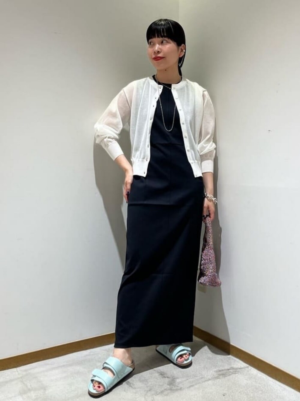 【身長】158センチ 【普段サイズ】 トップス S/ボトムスS・M(商品によって変わります)/シューズ23.5 【サイズ感】 ワンピース:標準的 158センチSサイズ 踝がしっかり隠れる長さです。 カーディガン:標準的 裾にリブが施されてるので、着丈のバランスも取りやすいと思います。ボタンを留めてニットライクに着ていただくのもおすすめです。 【コーディネートポイント】 モノトーンでシックな雰囲気のお洋服に、足元はライトブルーの<BIRKENSTOCK>「Uji」を合わせて爽やかな印象にまとめました。
