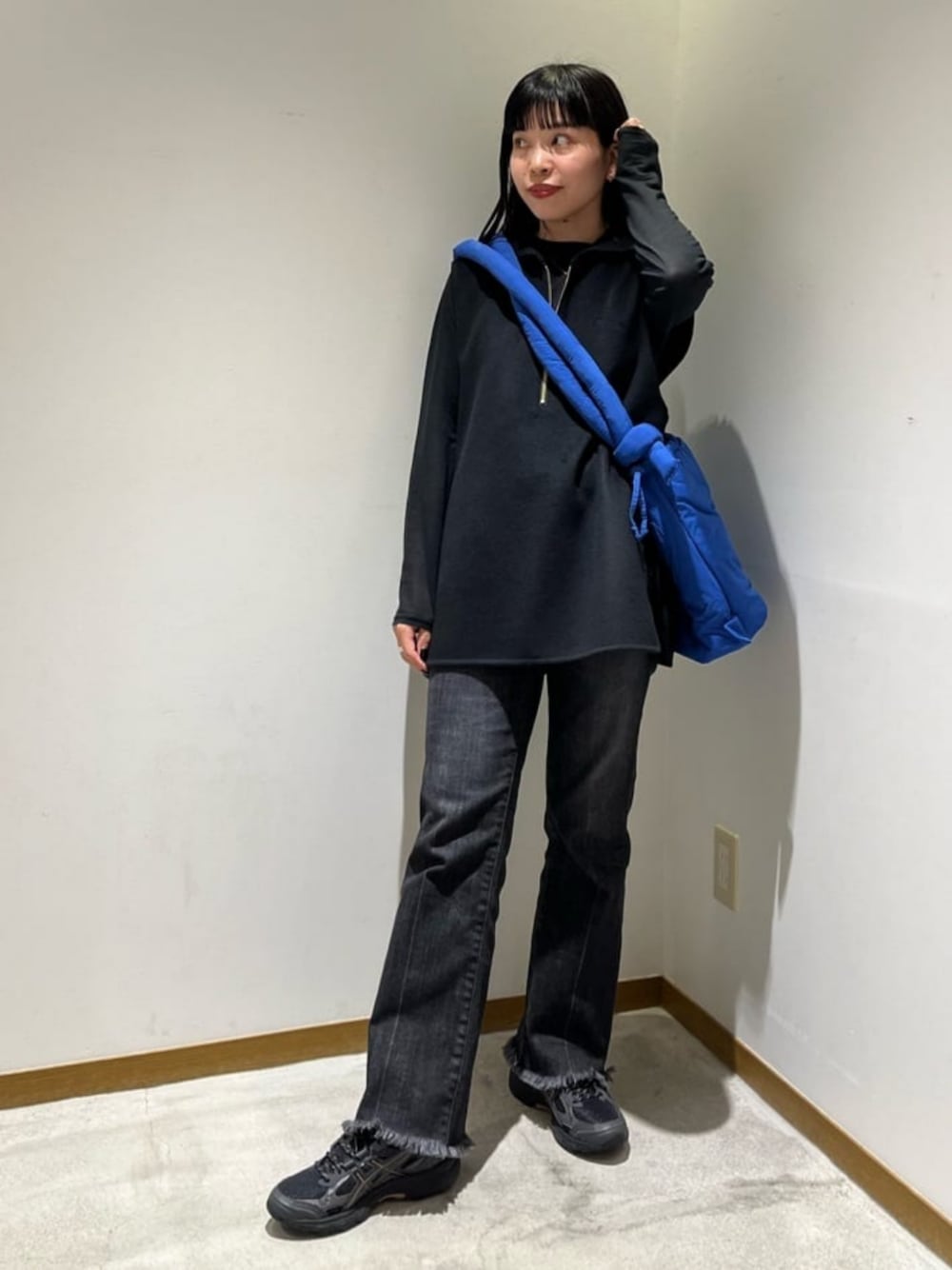 【身長】158センチ 【普段サイズ】 トップス S/ボトムスS・M(商品によって変わります)/シューズ23.5 【サイズ感】 ベスト:ゆったり ハーフジップにサイドのスリットで重ね着しやすいのがポイント。 やや長めの着丈でヒップもしっかり隠れます。 デニム:ややゆったり 生地に伸縮性があり、程よいフィット感と裾にかけてのフレアシルエットがとても綺麗なデニムです。 【コーディネートポイント】 ブルーのバックが映える様、ブラックでまとめたコーディネートです。