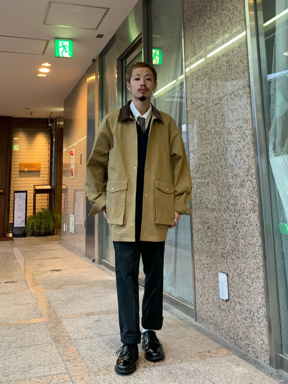 ブリティッシュトラッド風なスタイリング。カジュアルなワークジャケットをタイドアップに合わせることで落ち着いた雰囲気に。 着用アイテム : コーデュロイ切り替えワークジャケット サイズ感 : 大きめなつくり。着丈はお尻が隠れるぐらいの長さです。インナーに厚手のスウェット、ニットなど着られるサイズ感。 着心地 : 見た目ほど重くなく着やすいです。 着用アイテム :【HINSON/ヒンソン】オックスフォードハンティングベスト サイズ感 : 身幅は広めなので、シャツ以外にも薄手のアウターの上からも合わせられます。 着心地 : 厚くなく軽いです。ベストなのでレイヤードしても快適。 着用アイテム :【Vincent et Mireille 】別注ボタンダウンシャンブレーシャツ サイズ感 : 全体的にゆったり余裕がある感じ。 着心地 : 薄手のシャンブレー素材が肌触りも良く軽くて着やすいです。 着用アイテム :【Vincent et Mireille 】別注コットン ニットタイ サイズ感 : スッキリした幅でカジュアルフォーマルなシーンで使えます。 着心地 : コットンニットの素材で柔らかいです。 着用アイテム :【Vincent et Mireille】別注コーデュロイナロートラウザーパンツ サイズ感 : ウエストはベルトで絞った状態。わたりもそこまで太くないスッキリした細身のテーパードシルエット。丈は3回ほど折ったロールアップ。 着心地 : 温かみのある素材感で着心地も良いです。