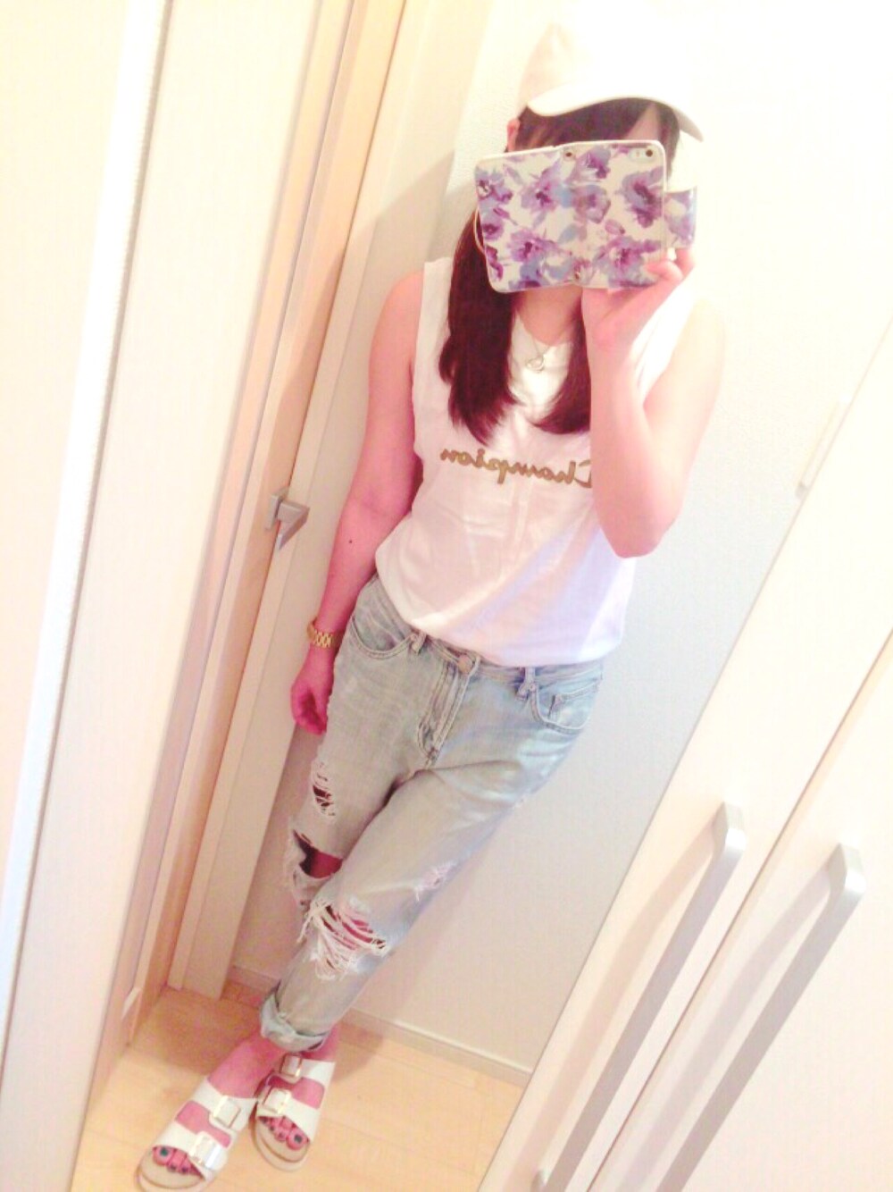 きょうは30度超えということで、 EMODA×Campionのトップス🤘🏻 デニムはだいぶ穴がいい感じに。 履き始めてもう4年目ですが。 そして先週買ったコンフォートサンダル 早速履いて出かけてきます🐳