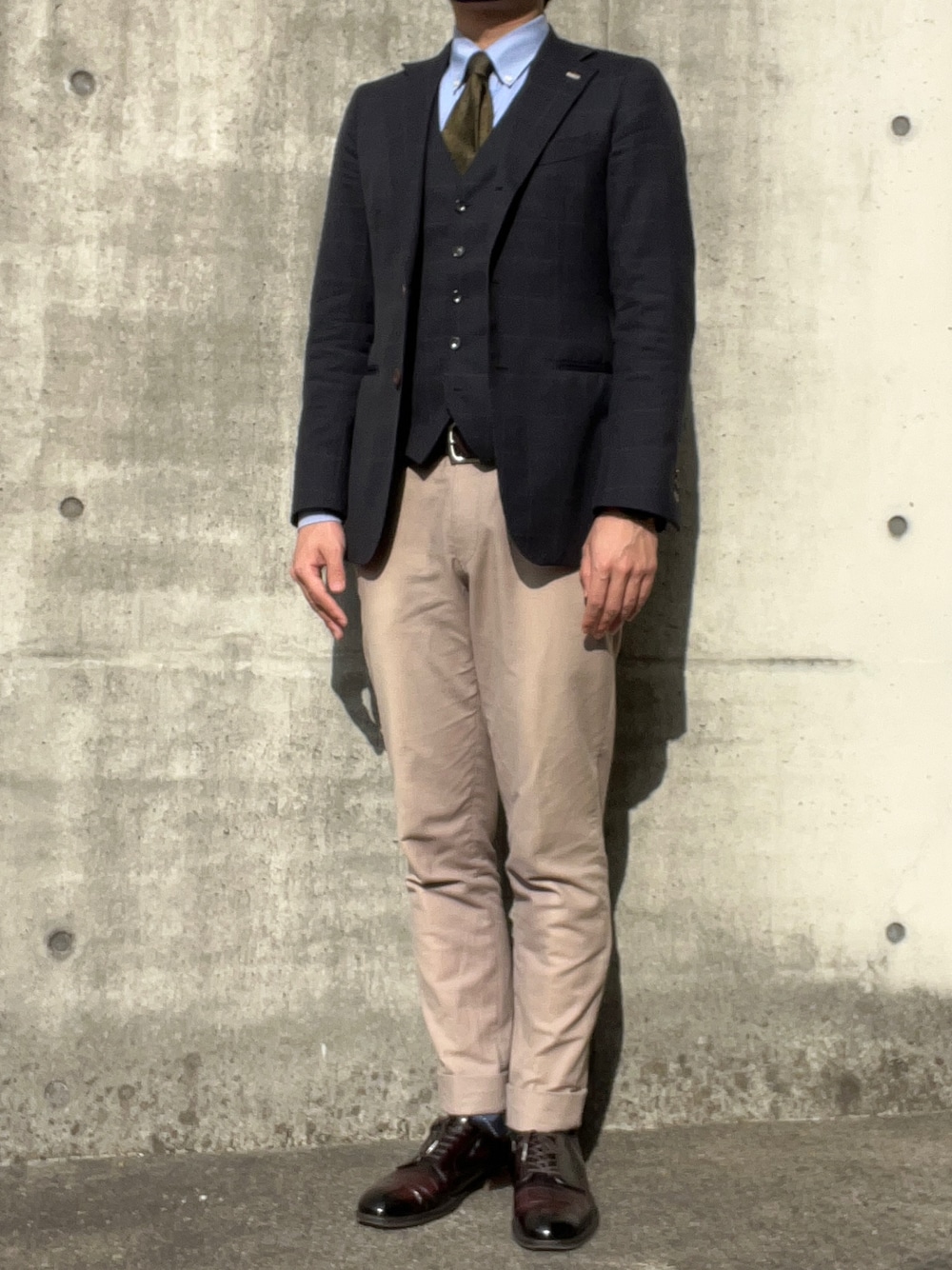 おはようございます!今日めっちゃあったかい!☺️ ジャケットにチノパン。 センタープリーツのところにあたりが出始めたから、そろそろ限界かな。。。