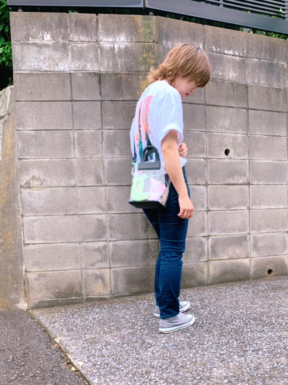 男女で着れるTシャツ 私の身長でLサイズを着ると 膝上くらいまで丈があります。 袖をロールアップすると いい感じになります! クリアバックもいい感じ👍✨