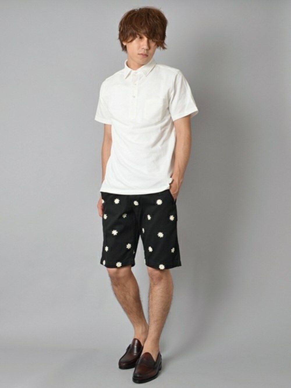 シンプルポロとプリントショーツのスタイリング!足元はスニーカーやエスポではなく、レザーローファーで締めました!