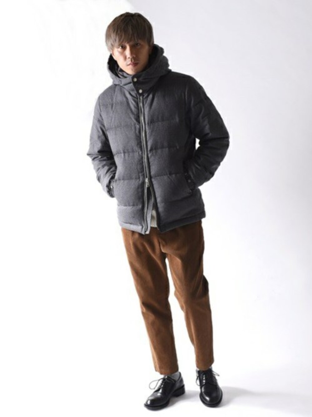 定番カラーのウールダウンジャケットにブラウンのコーデュロイパンツを合わせ落ち着いた感じを演出。 ボリューム感が出るダウンジャケットのためテーパードが効いたパンツを合わせスッキリさせました。