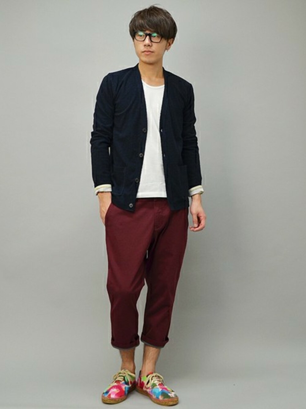 シンプルな無地がベースながら ワインカラーが新鮮なテーパードクロップドに パイル地のカーディガン、足元に柄を置くことで アクセントに! 素材感やカラーリングで遊びを加えたコーディネートです。