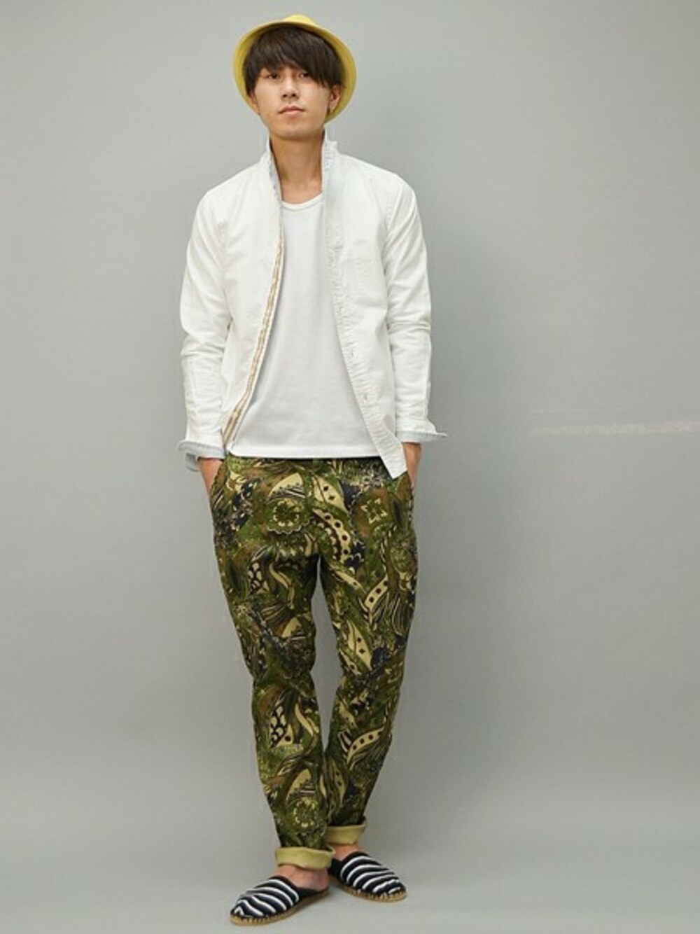 今季注目のテキスタイルグラフィックブランド【Nowartt】のテキスタイルを 落とし込んだパンツを主役に、白シャツ、小物でリゾート的スタイリングで まとめた爽やかなカジュアルコーディネートです。