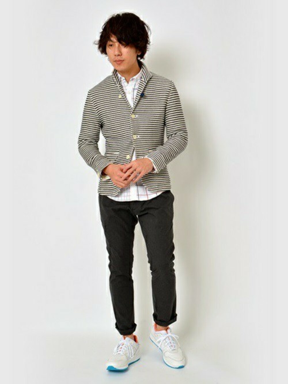 ボーダーのカットジャケットに足元はスニーカーでスポーツ感をプラス。