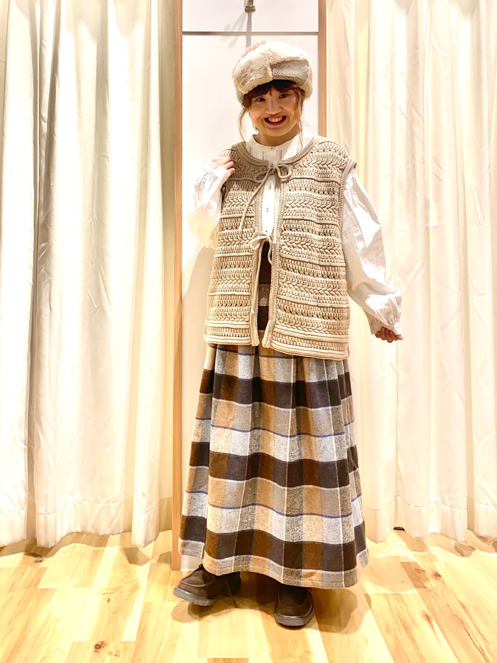 おはようございます☀︎ いつもご覧下さりありがとうございます😊 ベージュ色のかぎ針ベストとチェックスカートで ワントーンコーデ🐿 中着はピンタックブラウスでナチュラルな印象に♫ 大きなブロックチェックが目を惹くスカートは 履きやすくウエストのボタンで調節も出来ます!