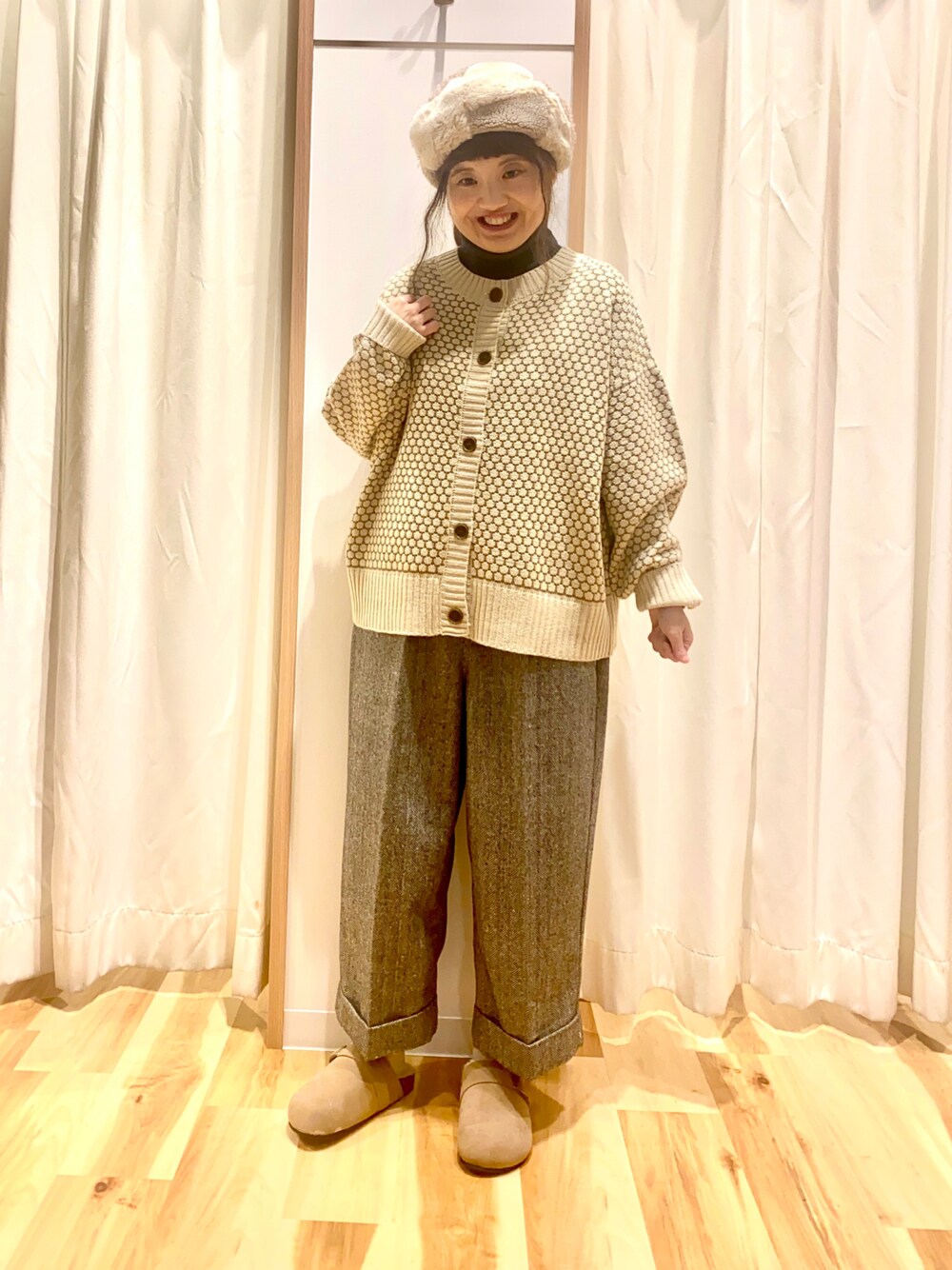 おはようございます☀︎ いつもご覧下さりありがとうございます😊 まんまるい模様が可愛いニットと センタープレスパンツでカジュアルコーデ🐯 ニットはゆるゆるシルエットなので 中にカットソー等合わせて着ても着膨れしにくいです♫ パンツはもともと裾がロールアップされており 低身長の方にもオススメです◎