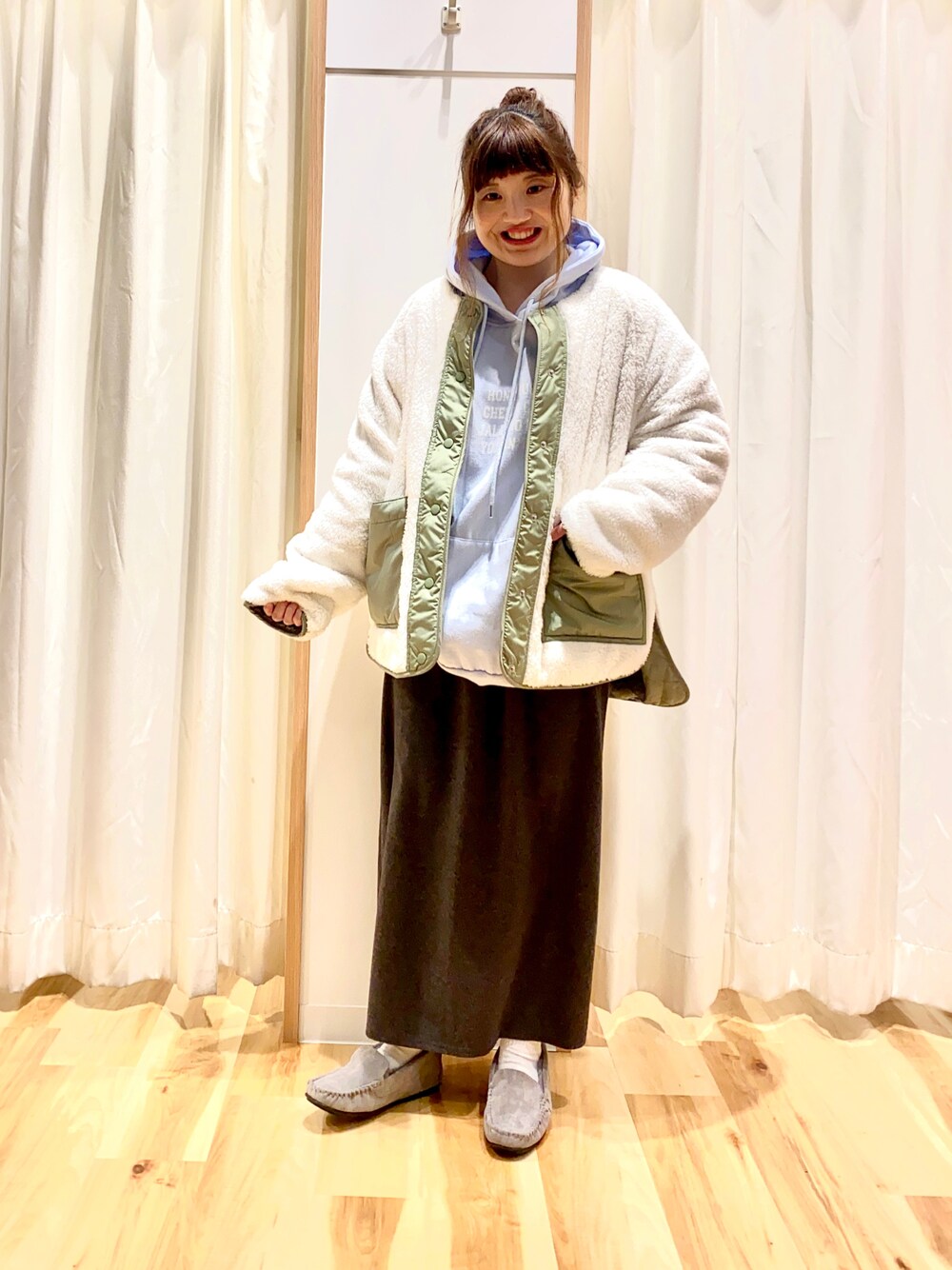 おはようございます☀︎ いつもご覧下さりありがとうございます😊 久々にsamansa mos2 blueのアイテムを着ました♫ リバーシブルのボアジャケットでカジュアルコーデ🐟 ジャケットはゆるっとしたシルエットで着心地◎ 後ろの丈が少し長めなのがポイントです✌️ パーカーとタイトスカートで合わせてゆるゆるに☺︎