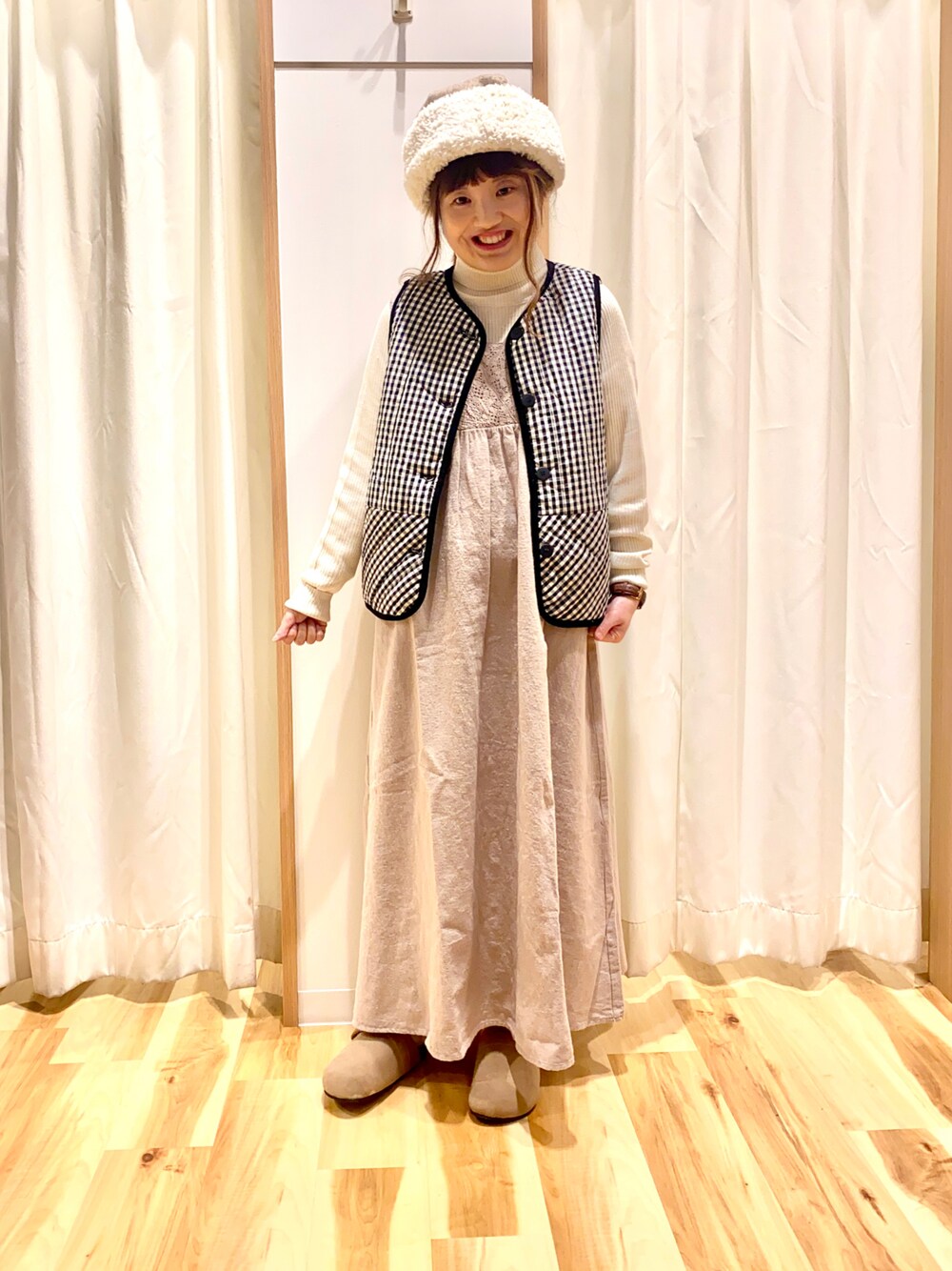 おはようございます☀︎ いつもご覧下さりありがとうございます😊 キルトベストとレースワンピースで ナチュラルガーリーコーデ🐶 ベストは中綿なので軽くて温かく 今から春にかけて長く着れます♫ パイピングデザインになっているのもポイント✨