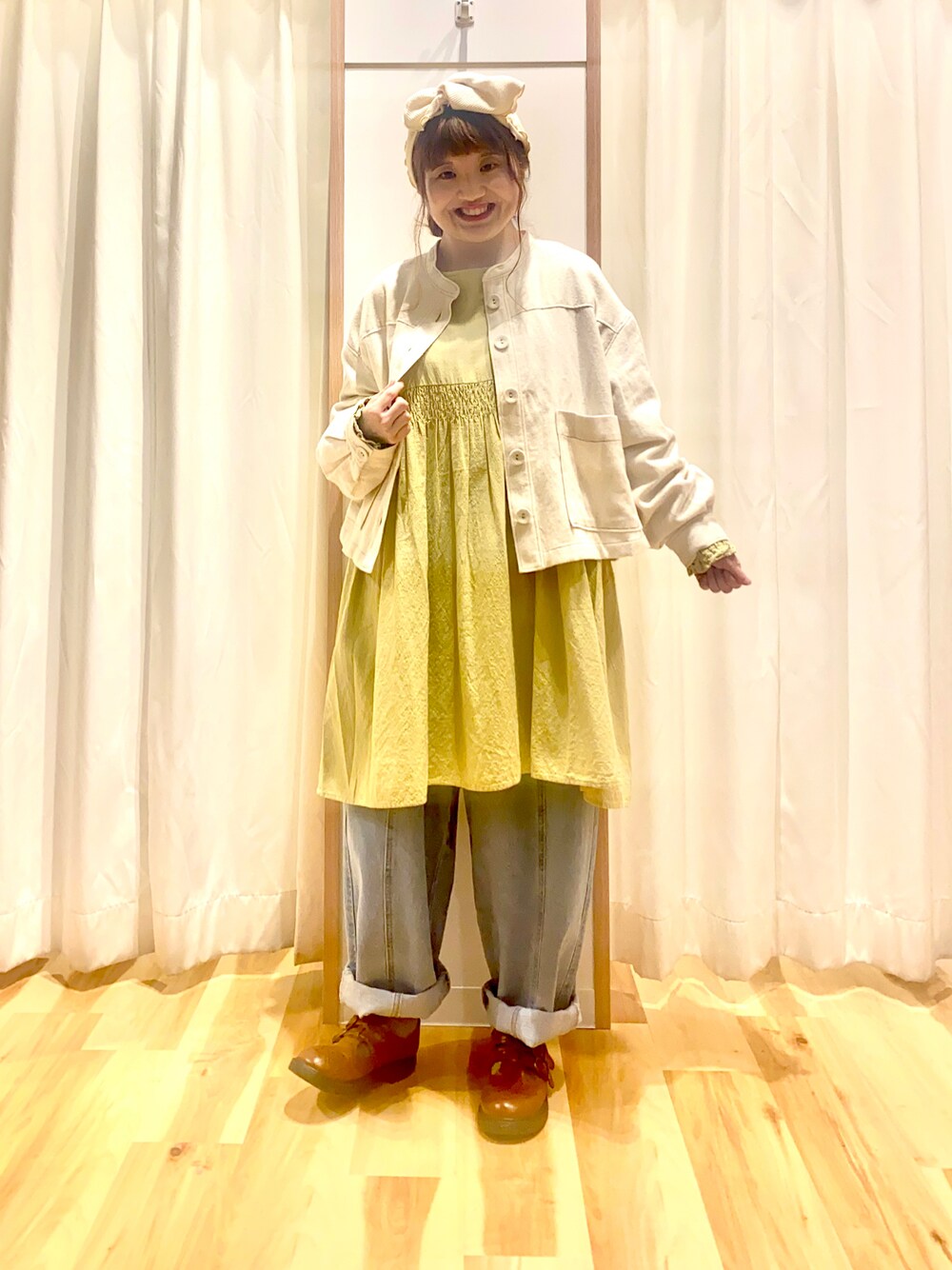 おはようございます☀︎ いつもご覧頂きありがとうございます😊 イエローのシャーリングシャツを差し色にして カジュアルコーデ🐣 シャツはお袖がシャーリングデザインで 調節できるので春から夏にかけて長く着れます! ダボダボになりすぎないよう ショート丈のブルゾンと合わせて スッキリまとめました♫