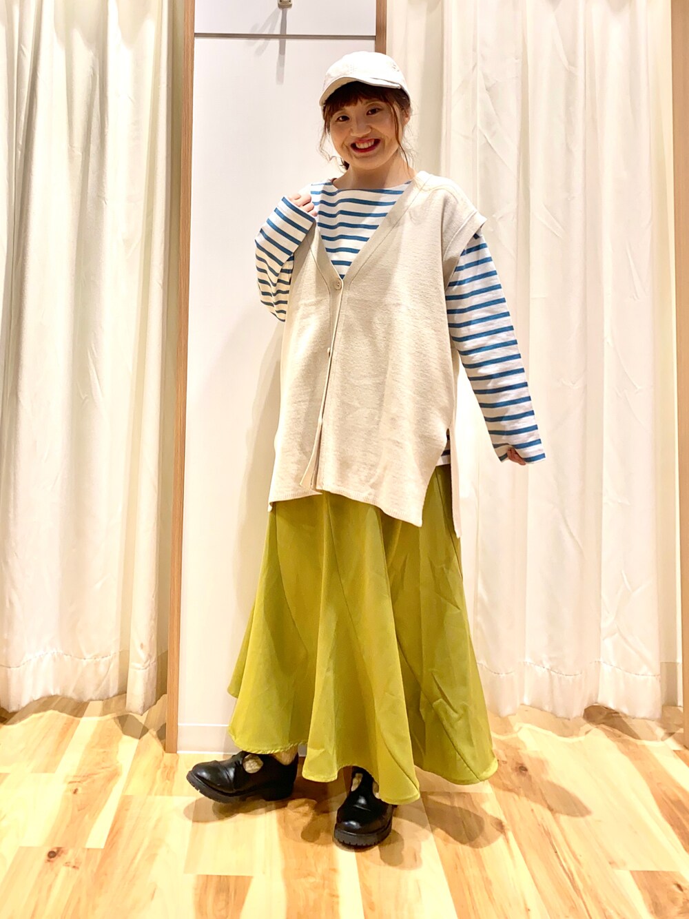 おはようございます☀︎ いつもご覧頂きありがとうございます😊 イエローのスカートを差し色にして キレイめコーデ🐝 スカートはシルエットがとてもキレイなので シンプルなトップスと合わせるだけで上品な印象に♫ ベストとボーダーのバスクシャツで カジュアルもプラスしました🌱