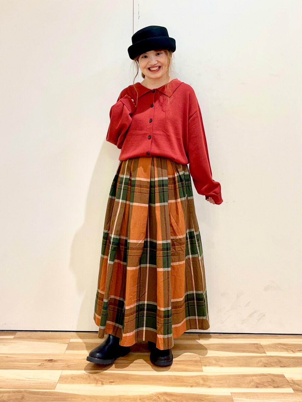 おはようございます☀︎ いつもご覧頂きありがとうございます😊 襟付きニットカーディガンと スカートでガーリーコーデ🦦 ニットはビッグ襟がポイントで可愛いです♫ 薄手なので今からの時期に着ても◎ 色に合わせてスカートも赤色にしました🌰