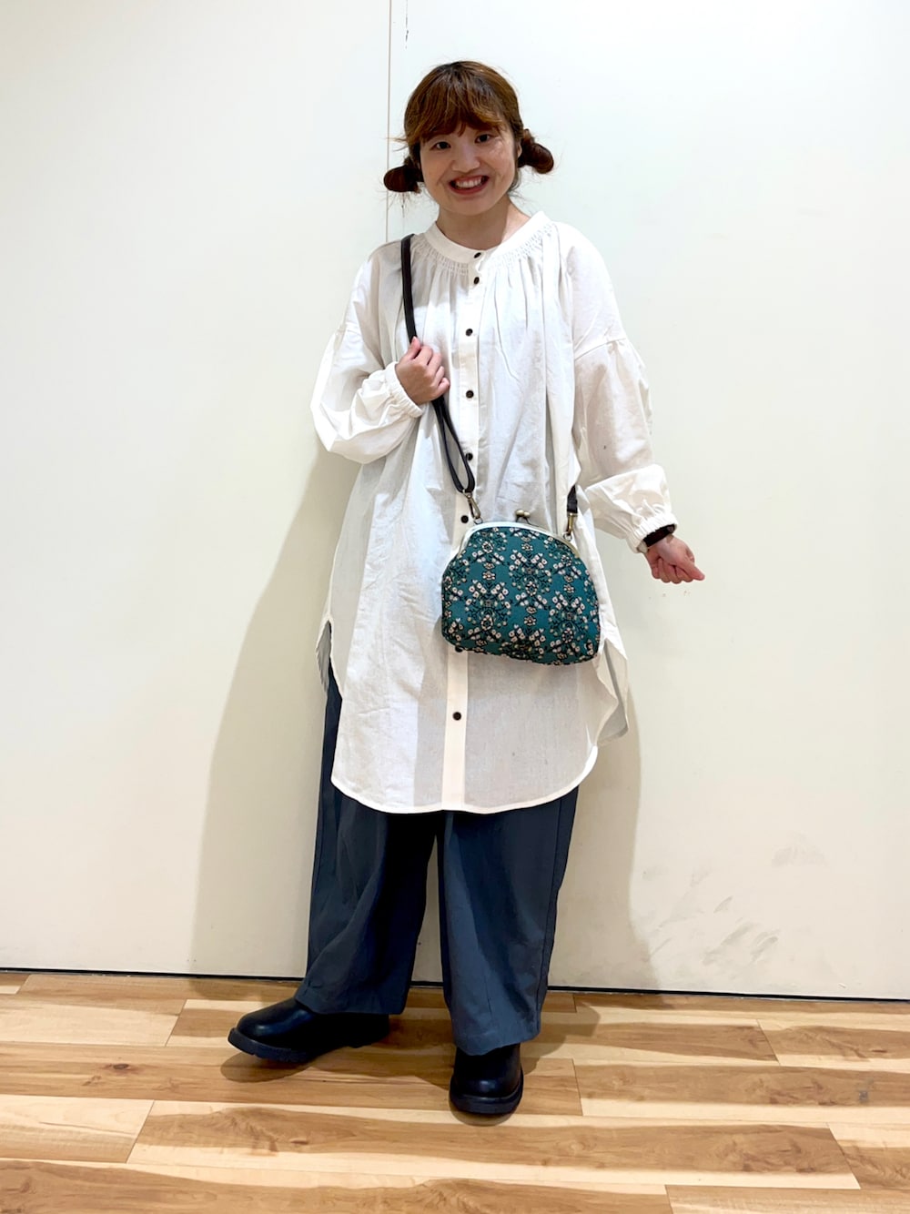 おはようございます☀︎ いつもご覧頂きありがとうございます😊 チュニックブラウスとエッグパンツで カジュアルコーデ🐢 チュニックは丈が長めなので体型カバー◎ ボタンの色がオシャレで可愛いのもポイント♫ コブラン織りのがま口バッグと合わせて 明るい印象にしました🧺