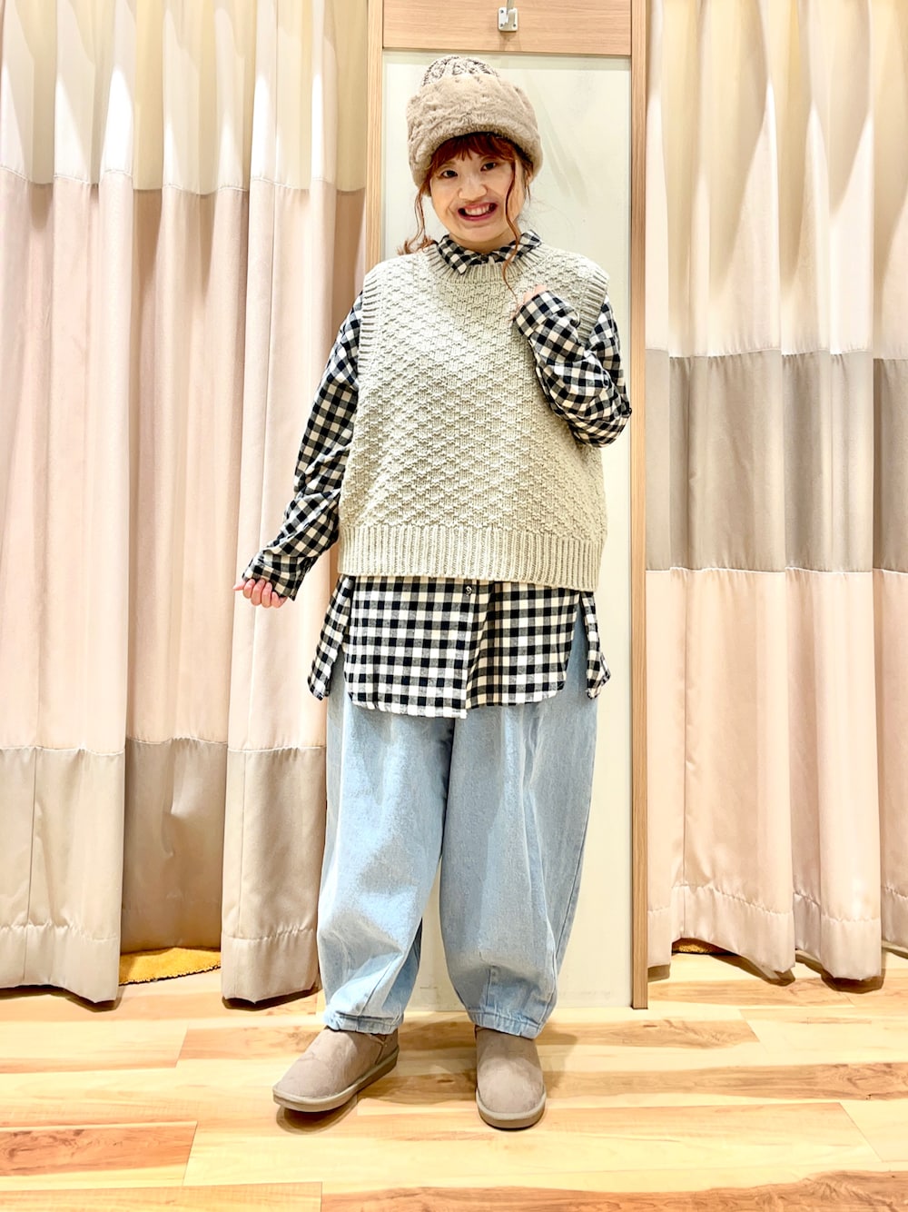 おはようございます☀︎ いつもご覧頂きありがとうございます😊 ブリティッシュウールのベストと チェックシャツでカジュアルコーデ🐄 ベストとチュニックシャツで レイヤードコーデにしました! チュニックは1枚で着たり 重ね着もしやすいので着回し◎ デニム生地のタックパンツと合わせて ゆるゆるにしました♫ このパンツ履き心地良いかつ 短めの丈なので低身長の方にもオススメです✨
