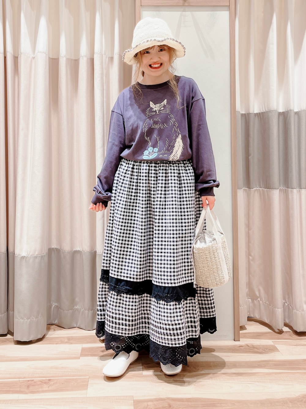 おはようございます☀︎ いつもご覧頂きありがとうございます😊 miyuki matsuoさんコラボのTシャツと スカートでカジュアルコーデ🐱 ギンガムチェックのスカートと合わせて 華やかな印象にしました♪