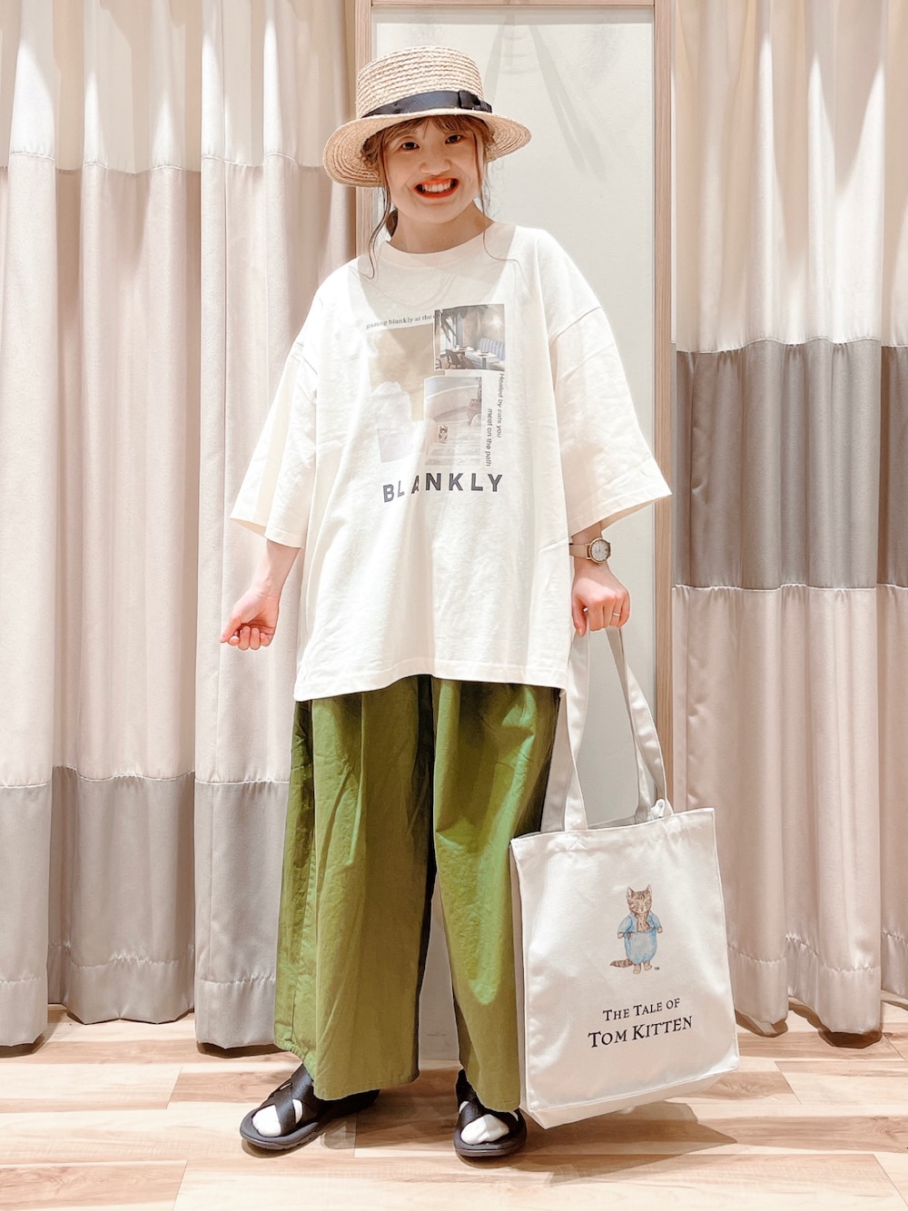 おはようございます☀︎ いつもご覧頂きありがとうございます😊 プリントTシャツと 先程投稿したパンツの色違いでカジュアルコーデ🌱 ワイドパンツはストンとしたシルエットなので スッキリした印象にも◎ プリントTシャツの猫ちゃんに合わせて トートバッグも猫ちゃんにしてリンクさせました🐈
