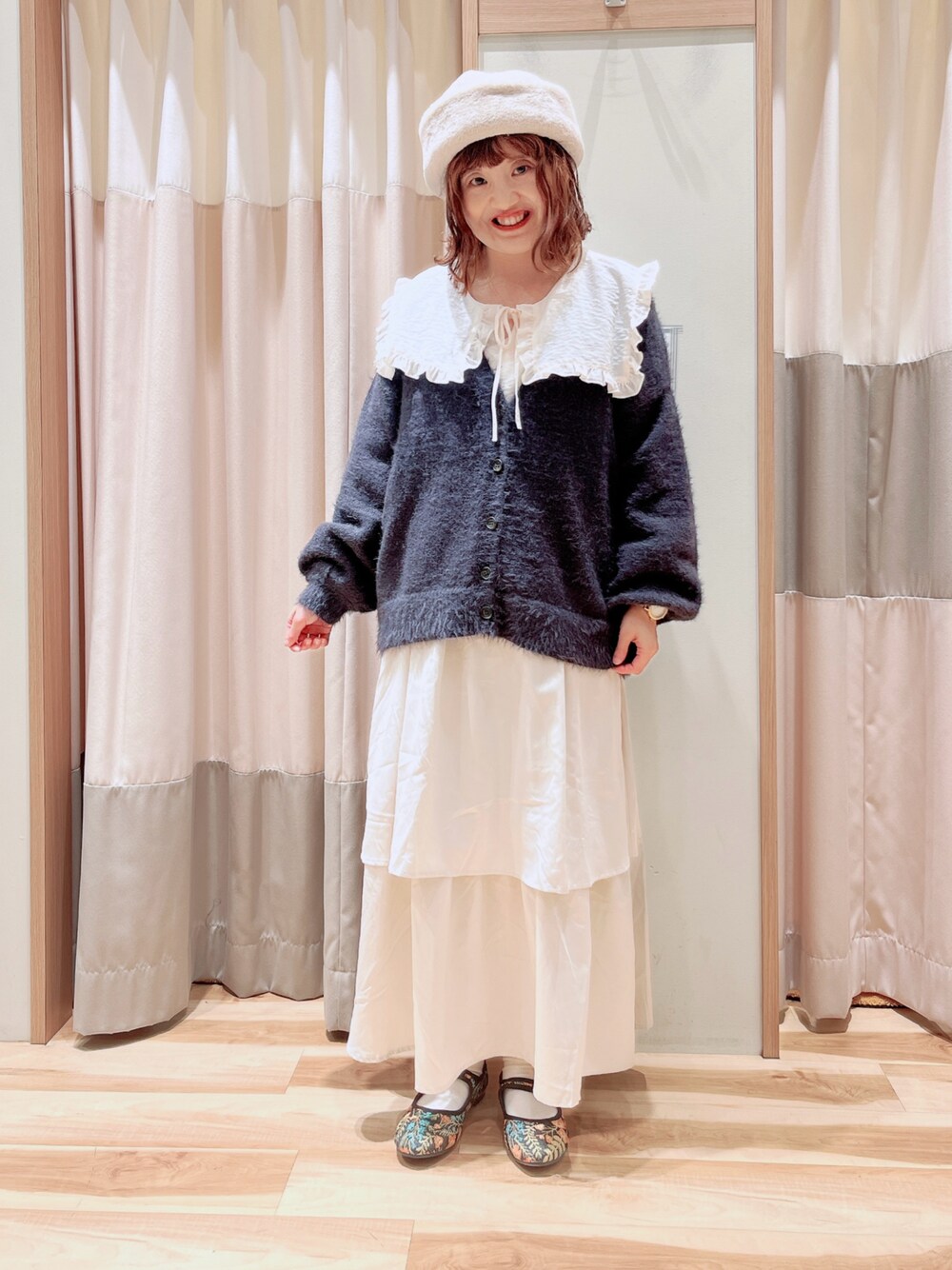 おはようございます︎☀︎ いつもご覧頂きありがとうございます😊 カーディガン色違いコーデ ティアードスカートと合わせてガーリーコーデ🐼 ビッグ襟のブラウスを合わせて華やかな印象にしました✌🏻