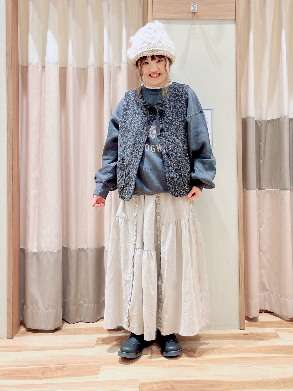 えりのベスト「花柄リバーシブル中綿ベスト」を使ったコーディネート