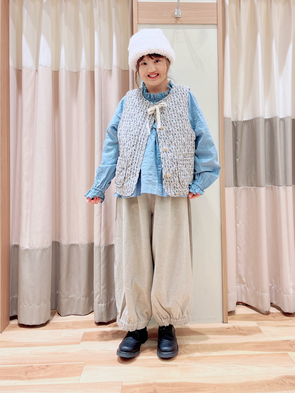 えりのベスト「花柄リバーシブル中綿ベスト」を使ったコーディネート