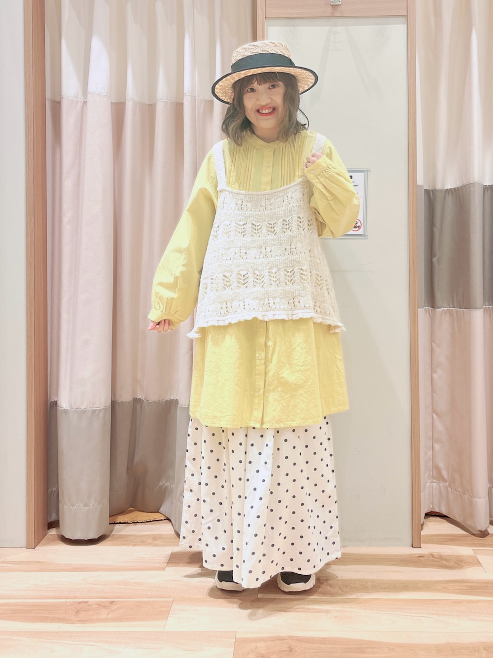 おはようございます☀︎ いつもご覧頂きありがとうございます😊 ビスチェ色違いコーデ イエローのバンドカラーシャツを差し色にして ガーリーコーデ🐣 シャツはチュニック丈ですが ストンとしたボトムと合わせると スッキリした印象になります♫