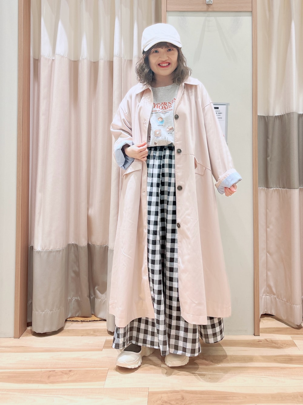 おはようございます☀︎ いつもご覧頂きありがとうございます😊 ステンカラーコート色違いコーデ ロゴTと合わせてカジュアルコーデ🐰 コートは春らしくピンク色にしました🌸 ギンガムチェックのスカートと合わせて メリハリをつけました♫
