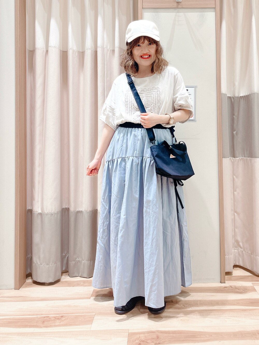 おはようございます☀︎ いつもご覧頂きありがとうございます😊 Tシャツ色違いコーデ スカートと合わせてガーリーと カジュアルのmixコーデ🐼 スカートはブルー系にして涼しい印象に♫