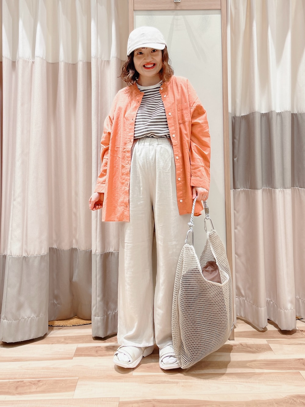 おはようございます☀︎ いつもご覧頂きありがとうございます😊 バンドカラーシャツ色違いコーデ カットソーと合わせてカジュアルコーデ🦫 シャツは差し色でオレンジにしました🍊 ひんやり加工なので夏も着て頂けるのがポイント♫ ウエストゴムのイージーパンツと合わせて ゆるゆるにしました⭐︎ 低身長の方にもオススメの丈感です🫰🏻